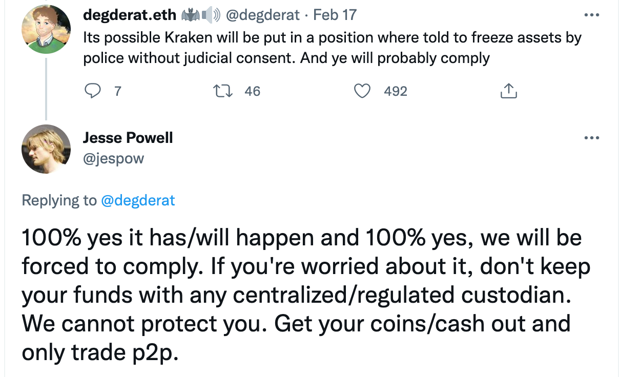 It also highlights the need for better privacy practices with Bitcoin. Take your coins off exchanges and custody them yourself. Coins that remain on exchanges are subject to state measures like the Emergencies Act, with which exchanges would have to comply. The CEO of Kraken acknowledged as much: