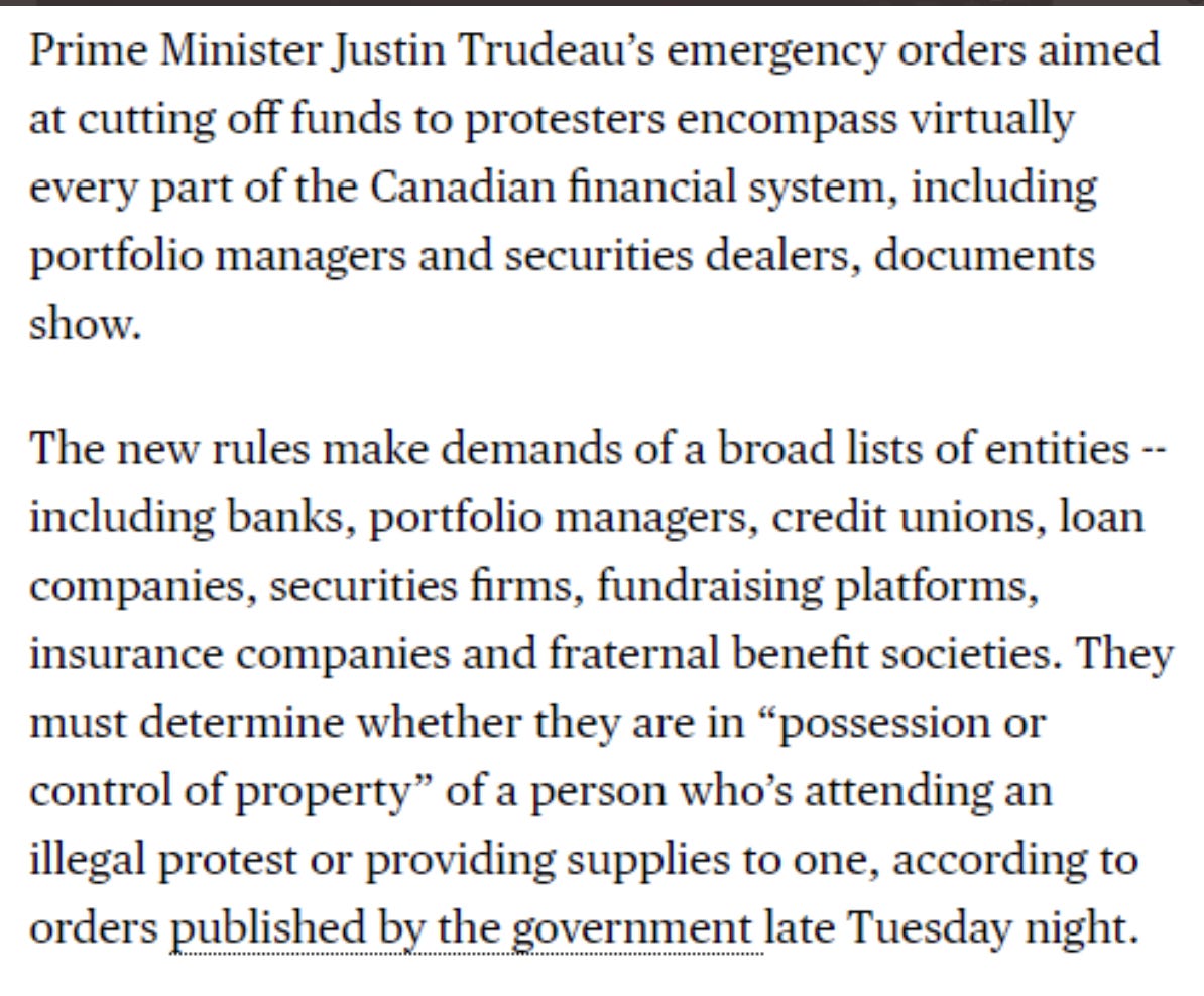 If you haven’t been following this the last few weeks, Prime Minister Trudeau invoked the Emergencies Act for the first time since it was enacted in 1988 in order to quell the aforementioned protests. The Act gives him the authority to direct financial institutions to freeze any accounts suspected of being linked to the protestors, without a prior court order. These powers were exerted and, as Deputy PM Chrystia Freeland confirmed, bank accounts were, indeed, frozen.