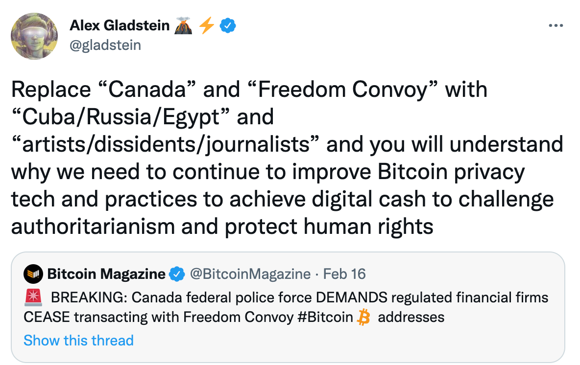While we’re on the topic of what is or isn’t ideologically consistent, regardless of whether you agree with the truckers in Ottawa who are protesting COVID-19 restrictions, the measures taken by the Canadian government only make more glaringly apparent the need for a censorship-resistant money that is not centrally controlled by the state.